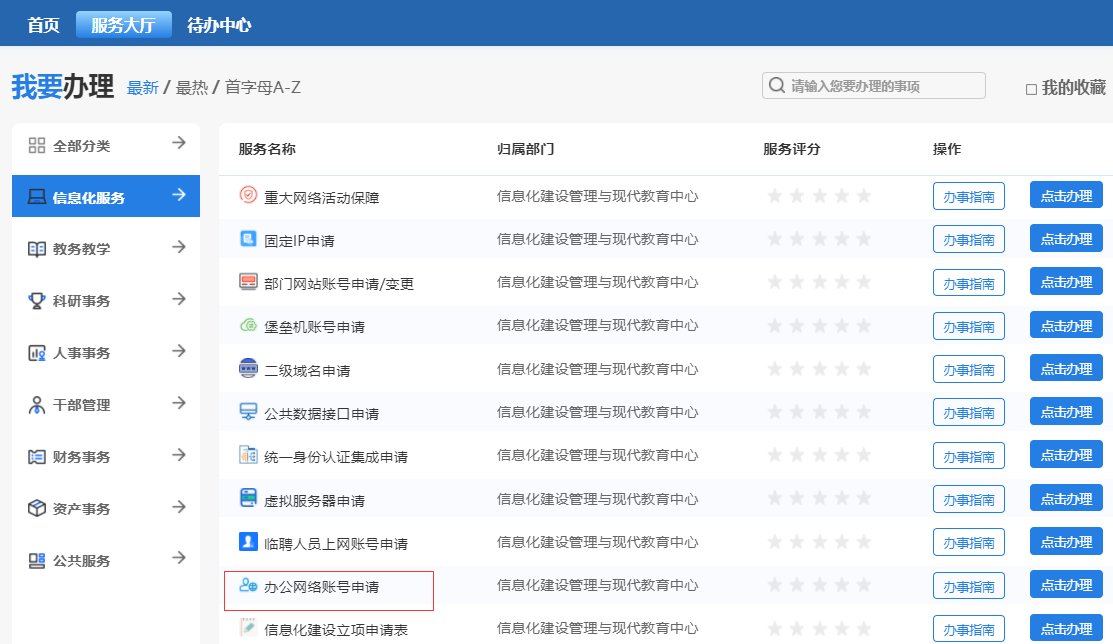 2.2 选择信息化服务、办公网络账号申请点击办理
