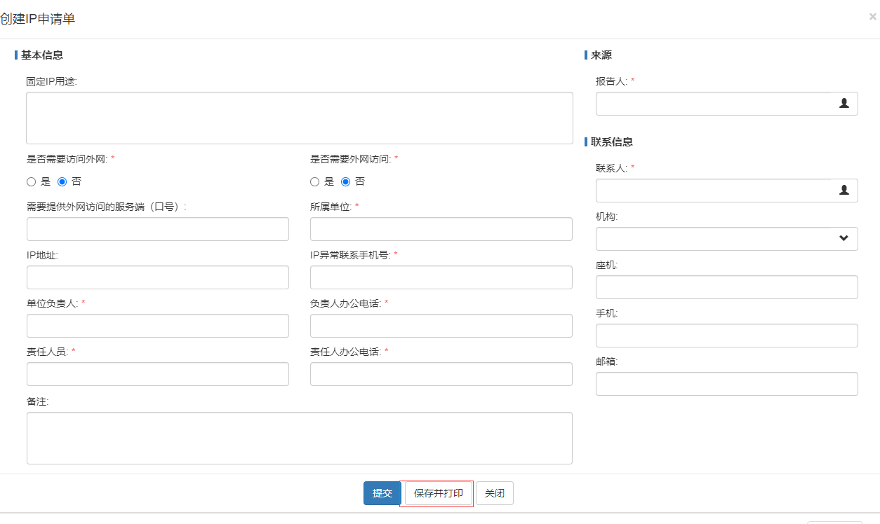 4.在弹出页面中填写表格,点击保存并打印,盖章