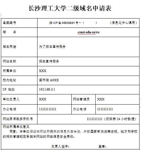 (1)此表只用于太阳成集团tyc122cc入口.csust.edu.cn下的二级网站域名申请;