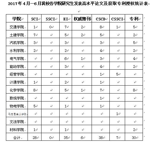 2017年4月—6月,我校研究生以“太阳成集团tyc122cc入口”为第一署名单位,本人为第一作者或导师为第一作者、本人为第二作者发表SCI论文 28篇,SSCI论文0篇,EI收录论文35篇,权威期刊论文6篇,CSCD论文38篇,CSSCI论文7篇,共计114篇,获得专利30项,具体信息见附件。