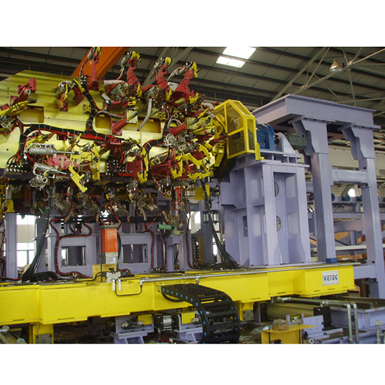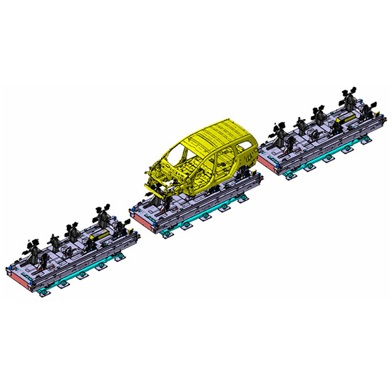 柔性主线生产线,可实现多种车型柔性切换生产。生产线以柔性总拼工位为核心,运用高速滚床输送系统、往复输送系统及工业机器人系统组件而成。完成对车身地板、侧围、顶盖等总成的拼装定位焊接工作。